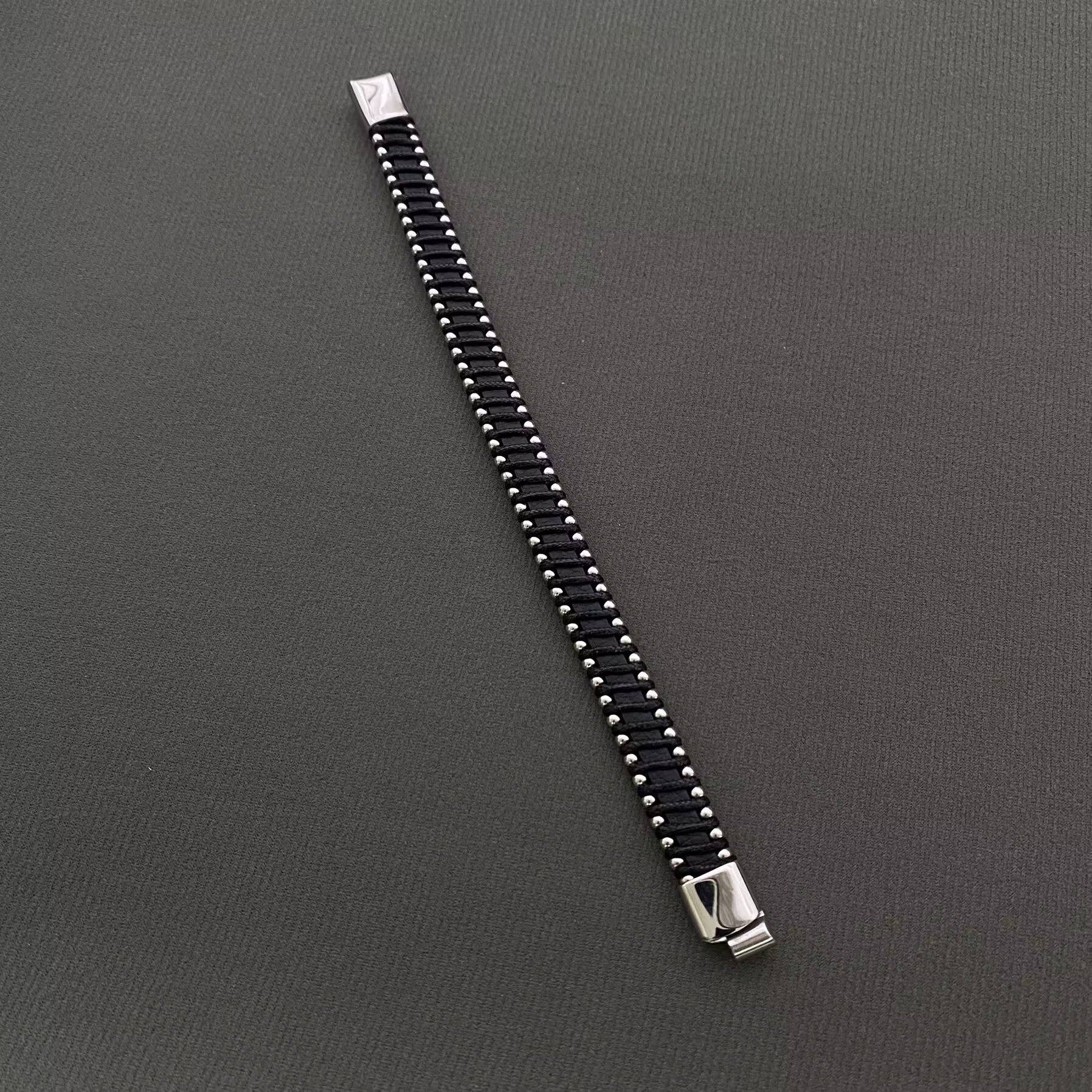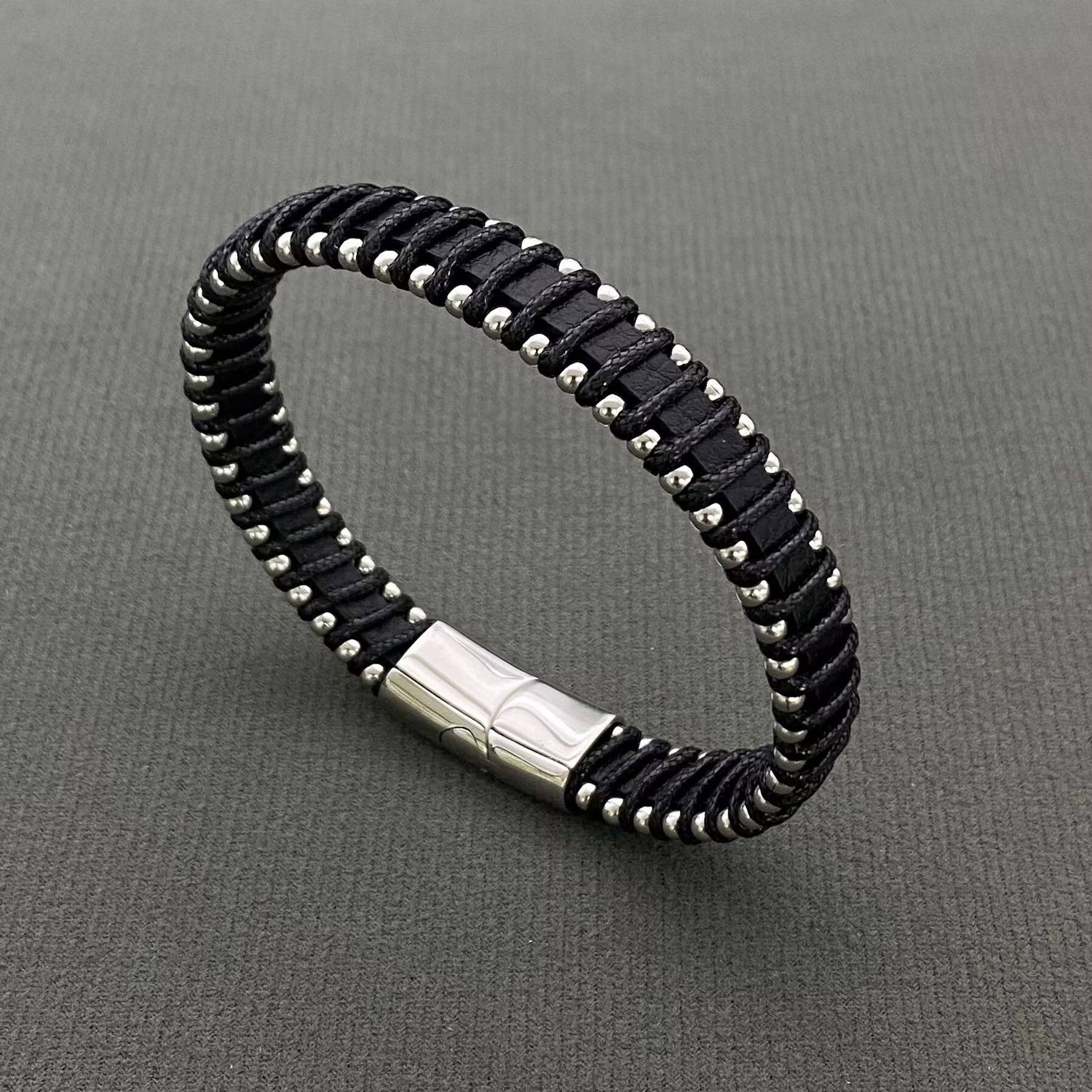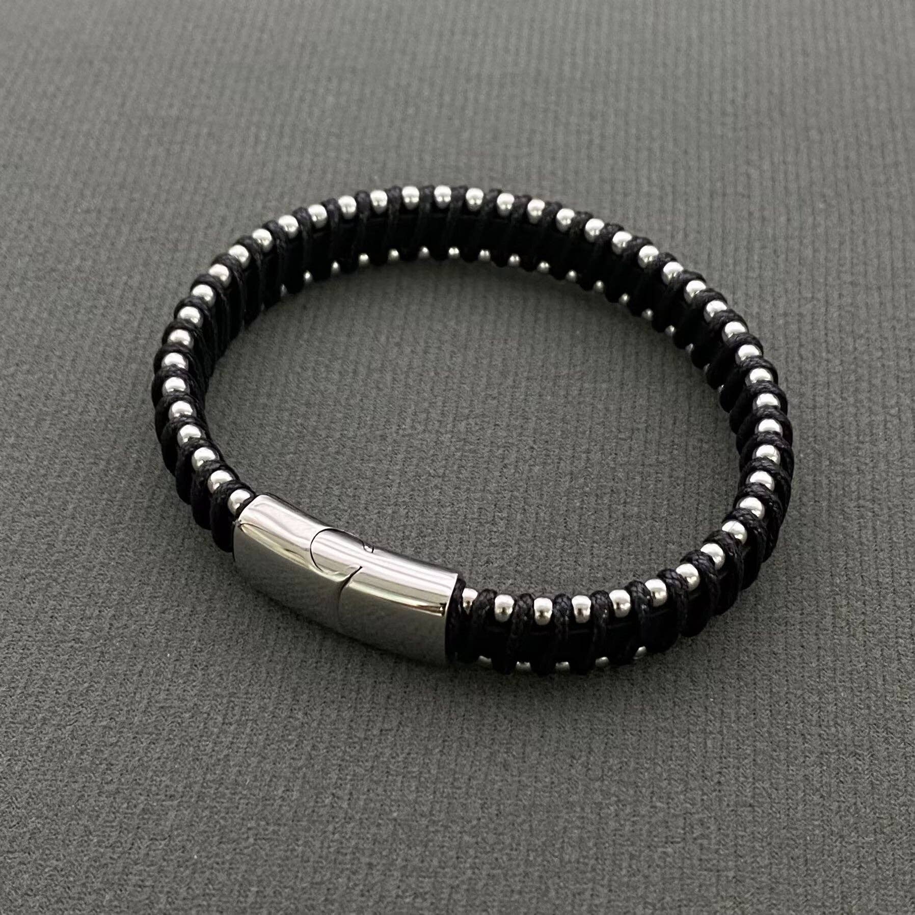 Men's Stainless Steel Beads Leather Woven Bracelet - MJ/BC