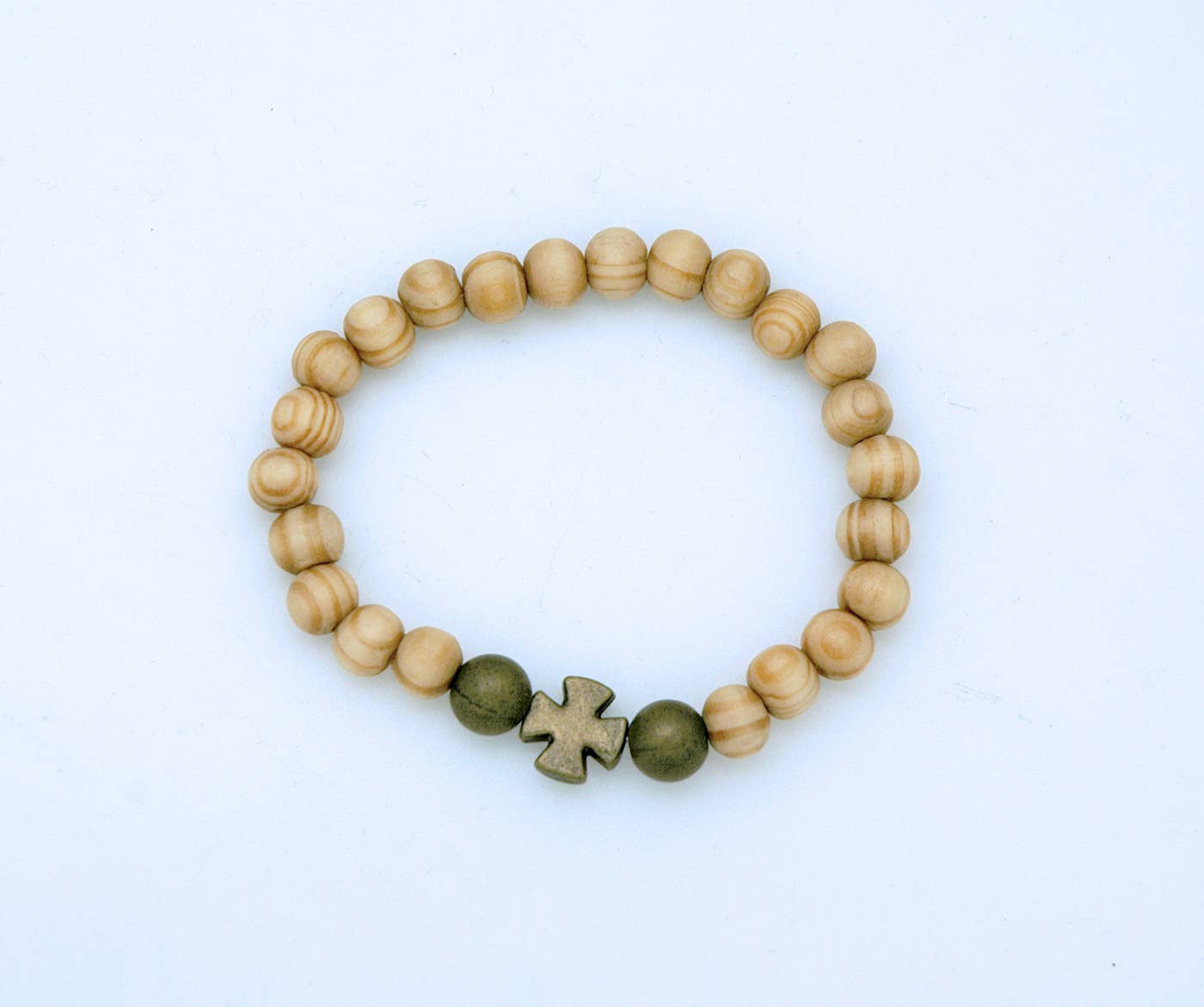 Wood bracelet w/ bronze color cross on elastic from fatima
